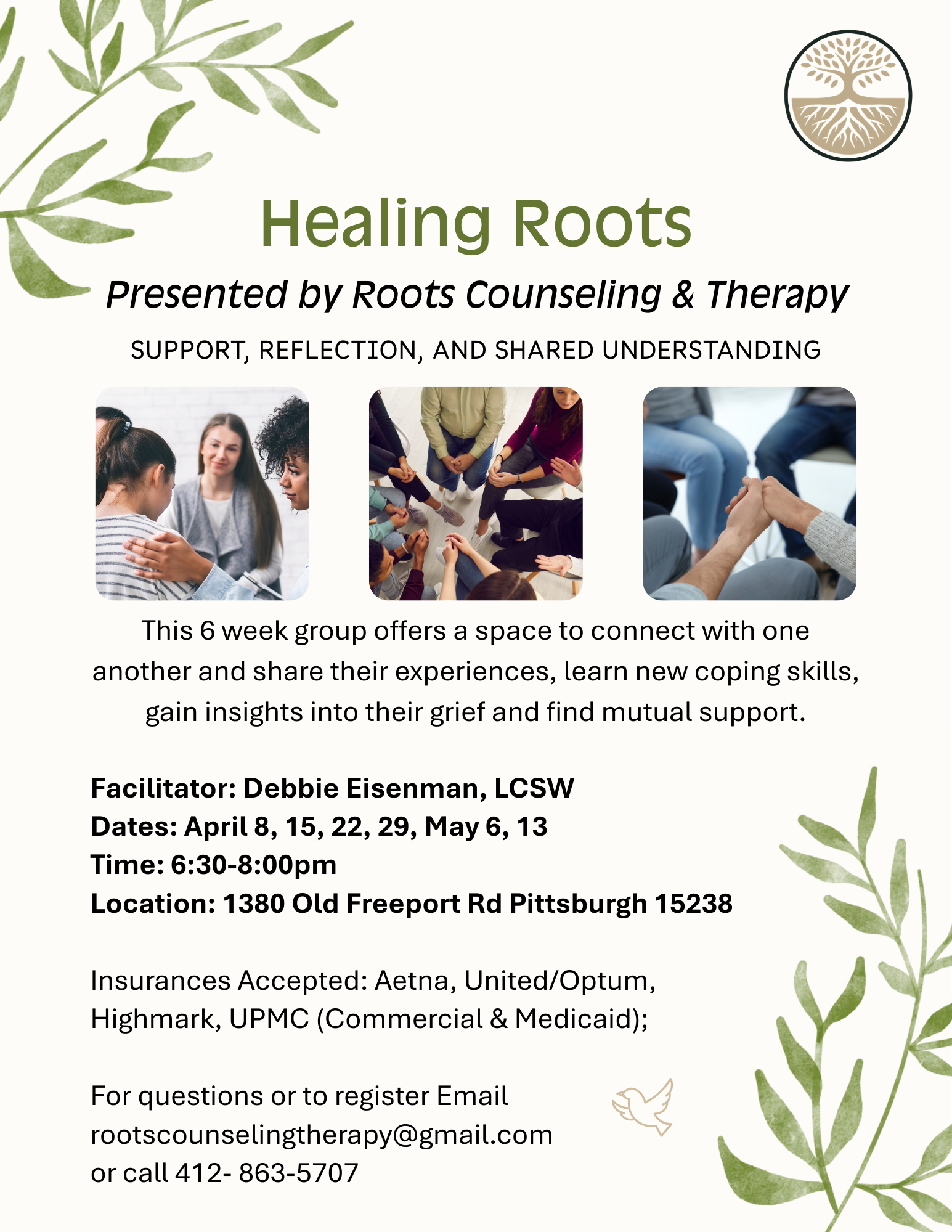Payment: The following insurance plans will be accepted to cover the cost of the group - UPMC, UPMC for You, Highmark, Aetna, Optum/United. If you choose to use insurance, please be aware that you are responsible for any copay, coinsurance, or deductible associated with your plan. If your insurance denies your claim, you will be responsible for the total amount of the fees. If you are not using insurance, the fee will be $50 per group session and you must participate in all 6 sessions. If you no show to a group there will be a $40 charge. Please communicate with the facilitator of any inability to attend a session of the group. The group is most successful when all participants are in attendance.